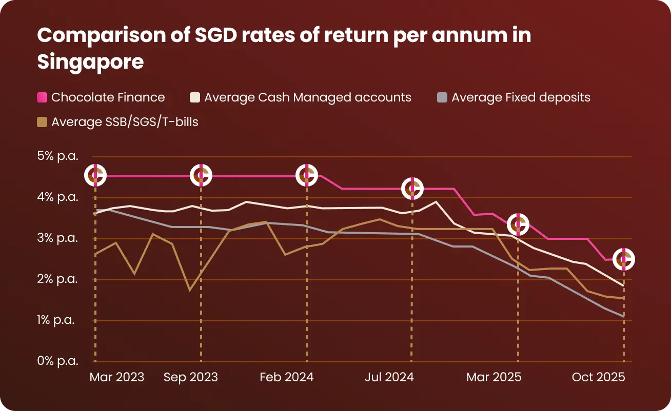 Data sourced from MAS and WealthFor.Us for Singapore government instruments (SSB, SGS Bonds, T-Bills); fixed deposit rates from major banks and finance companies in Singapore (e.g. DBS, OCBC, Maybank, RHB, Standard Chartered); and publicly available yield information from local cash management products including Endowus, FSMOne, PhillipCapital, StashAway, Syfe and Maribank. Chocolate Finance rates are as of the 4th November 2025.