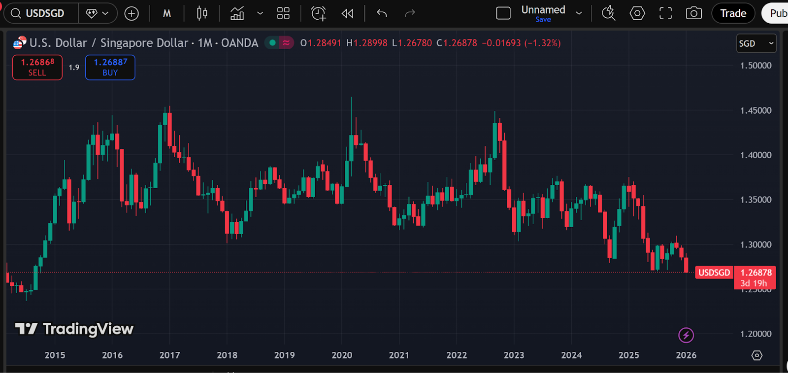 As you can see from the screenshot above, USD/SGD is hovering near decade-low levels, trading at 1.26878 at the time of writing. In layman terms, this means that USD 1 is now worth SGD 1.26, a significant drop compared to one year ago, when \USD 1 was worth SGD 1.36!